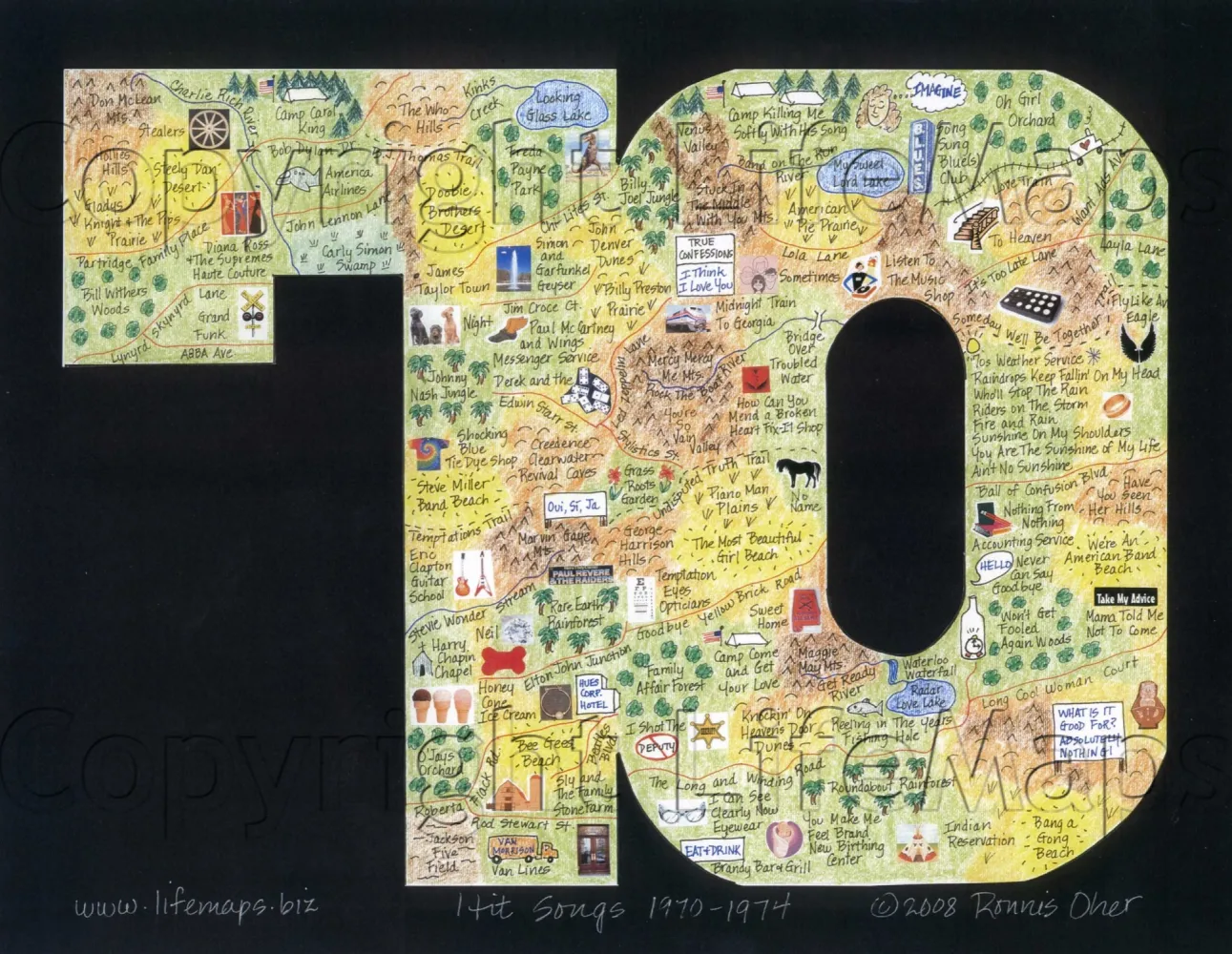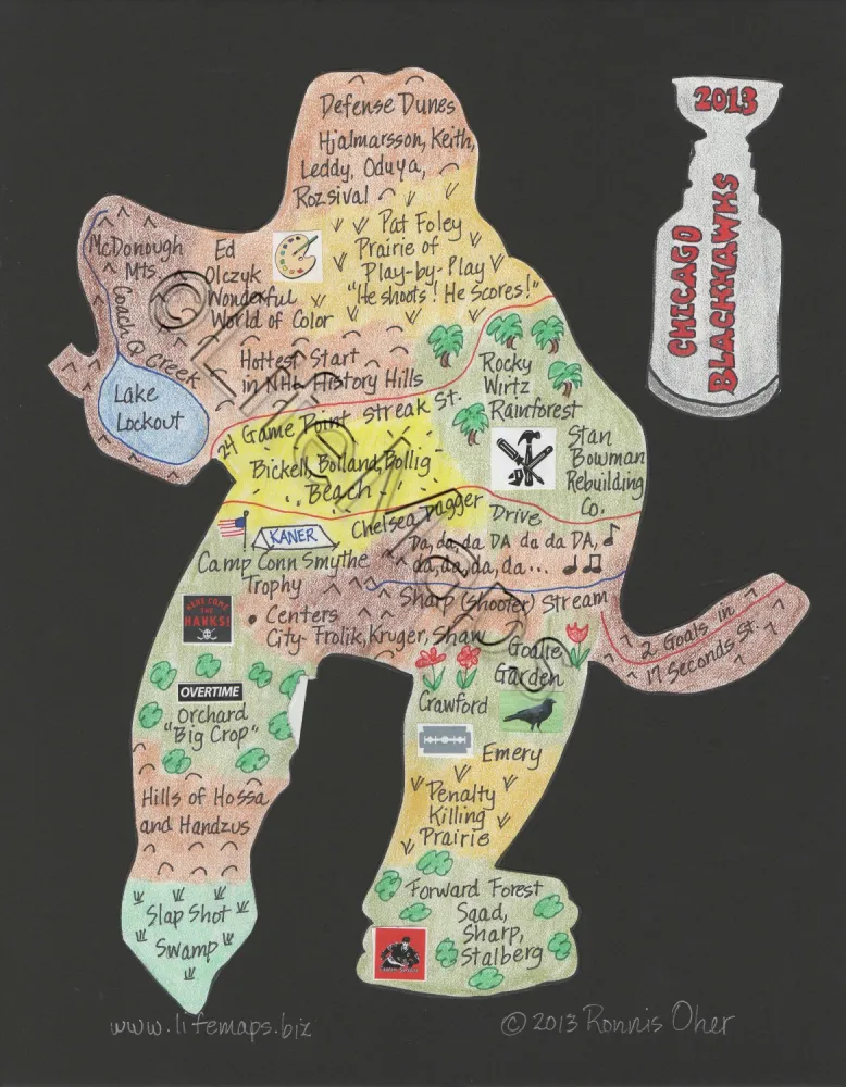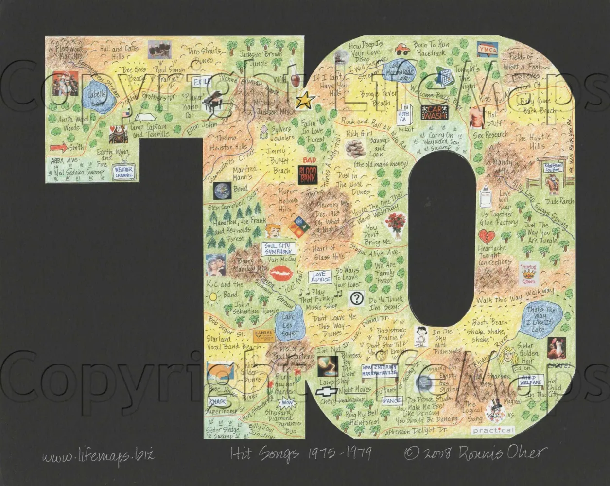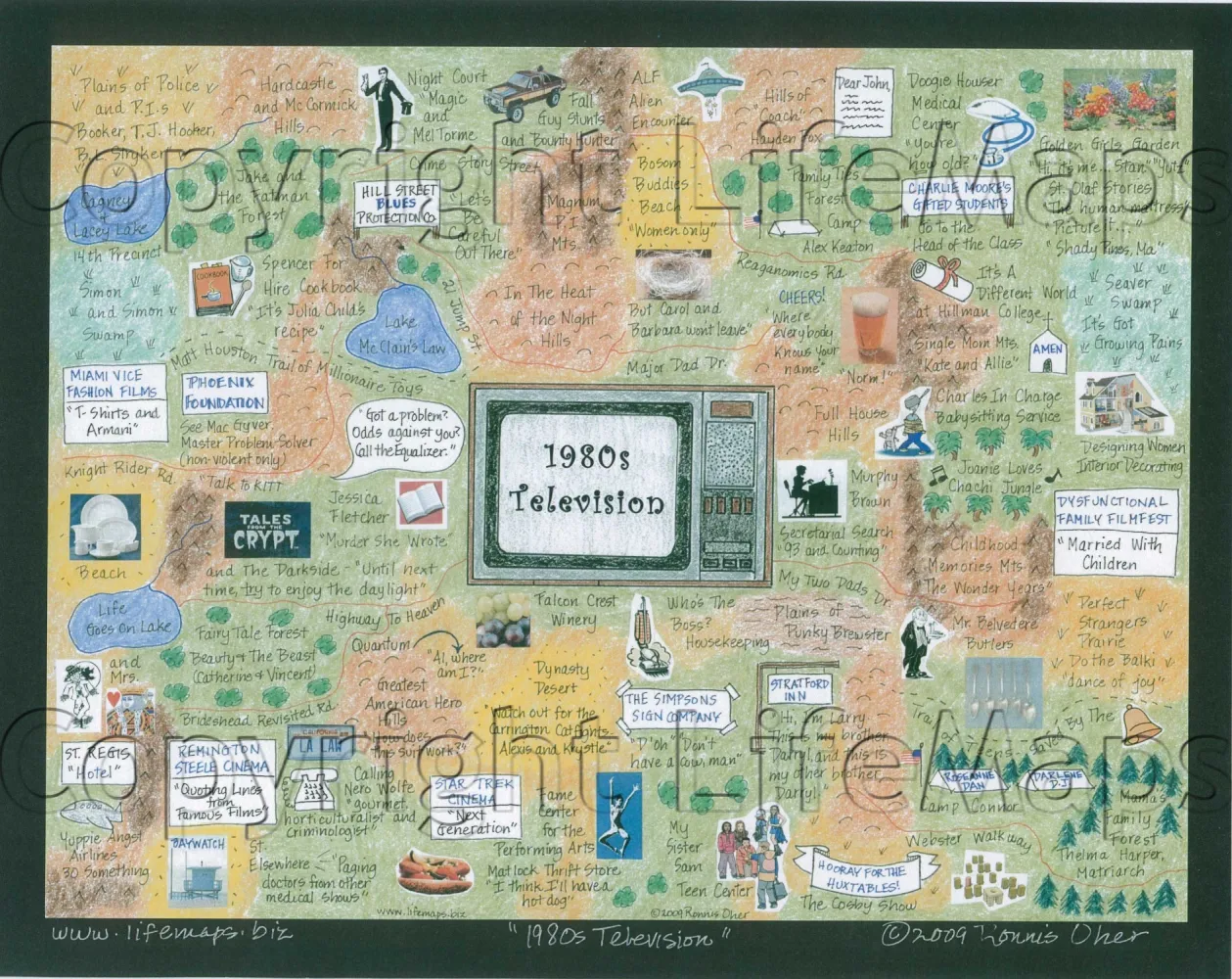 These maps celebrate the music of specific artists, groups and eras; classic TV shows (by decade) and sports teams. Maps are mounted on mat board with a finished size 11" x 14" and are available unframed.