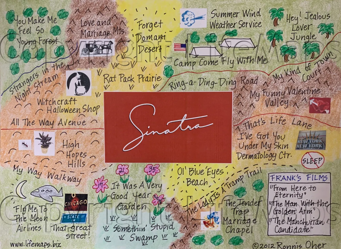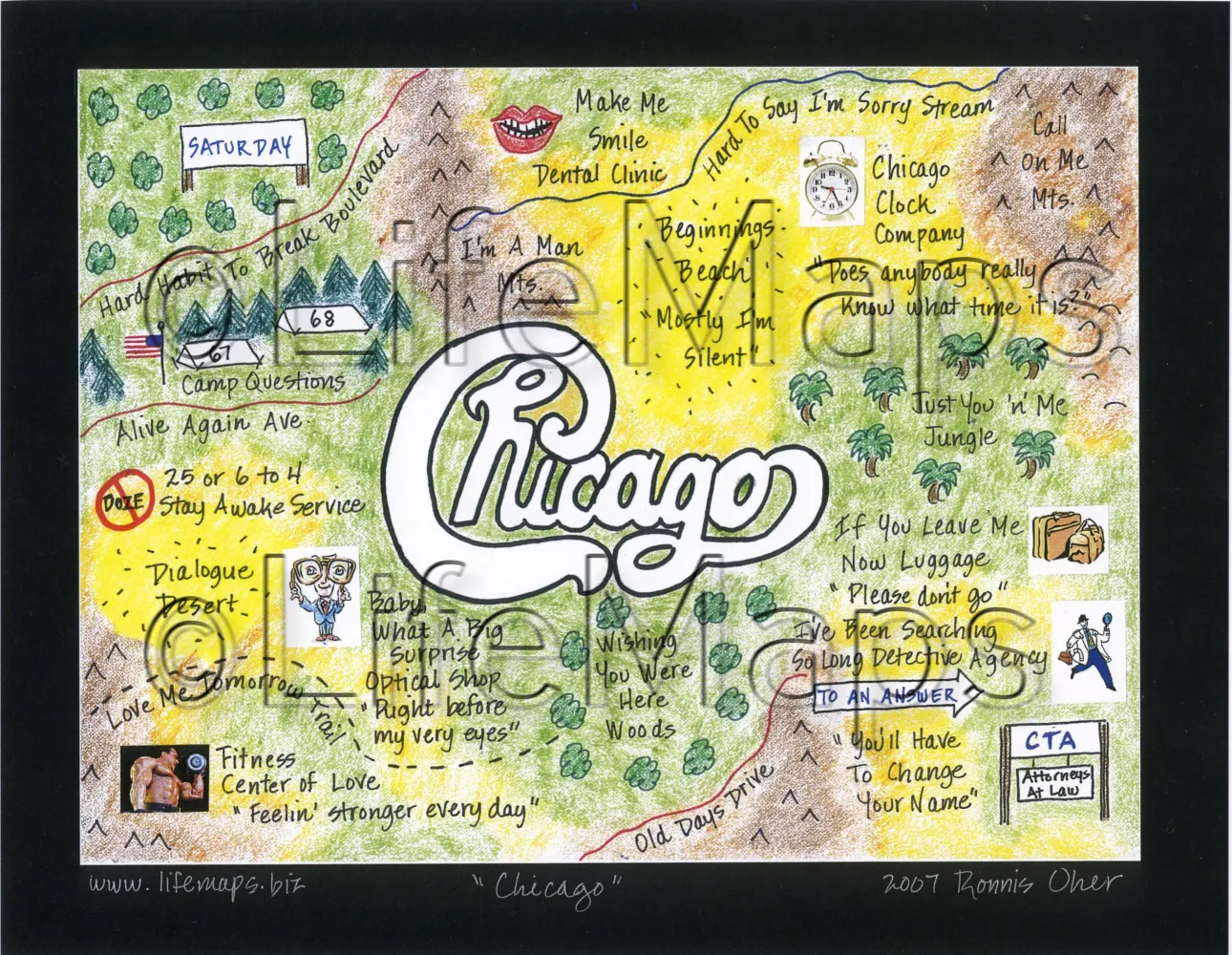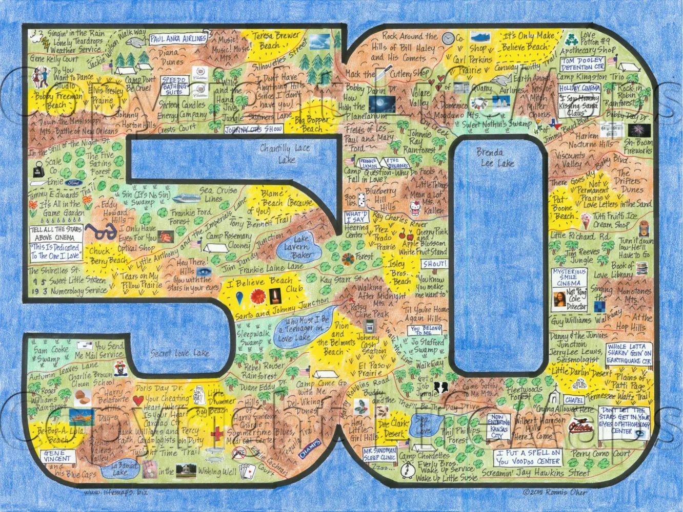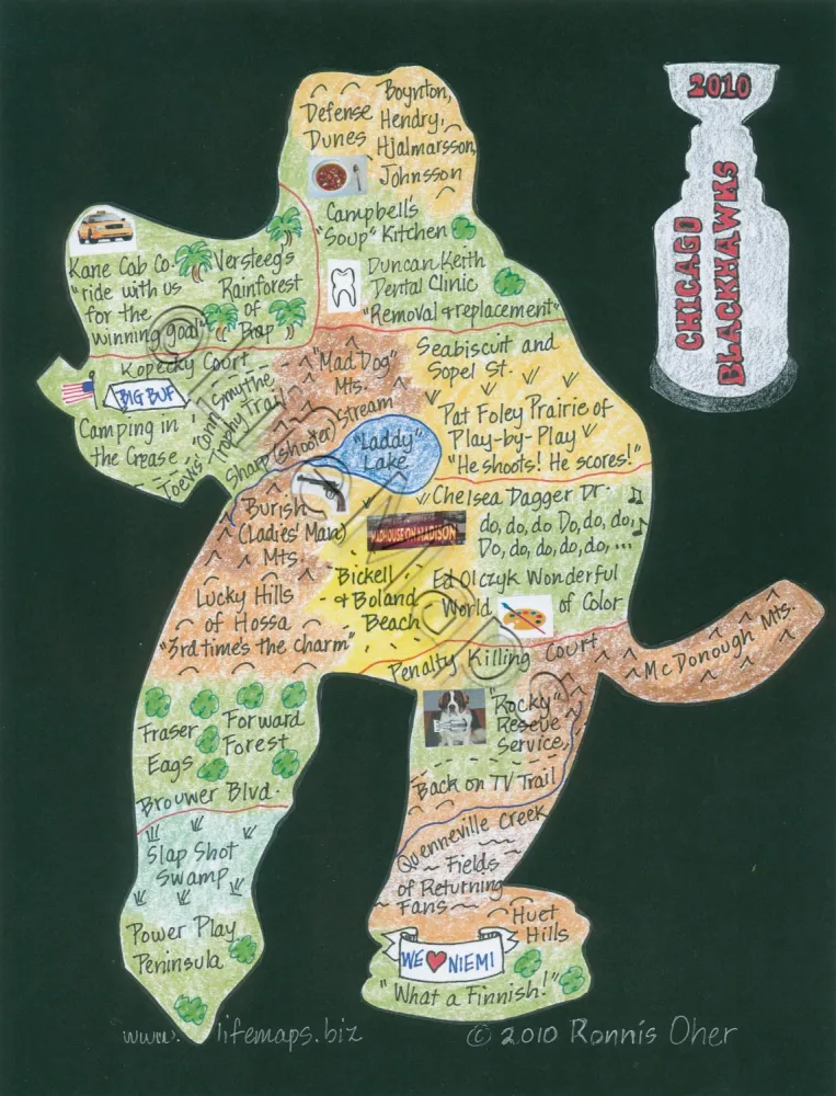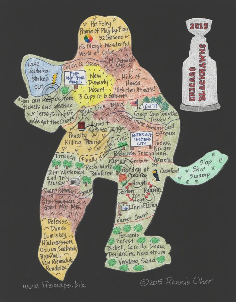 These maps celebrate the music of specific artists, groups and eras; classic TV shows (by decade) and sports teams. Maps are mounted on mat board with a finished size 11" x 14" and are available unframed.