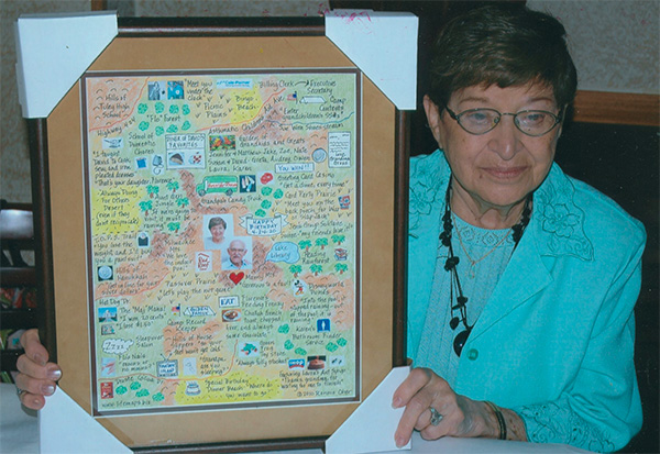 Shortly after I did this 50th anniversary map, the wife passed away. A few months later I met a woman who knew the couple. She told me, "They had your map on display at her funeral and everyone enjoyed reading all the stories about her."