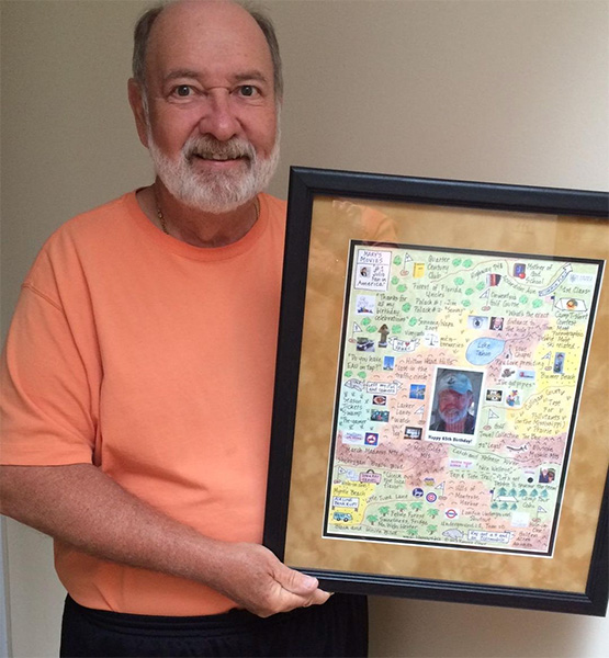 "Last night I finally settled down to 'study' the map you created of my life. Your creation required quiet time to read and re-read; laugh and savor memories. It is amazing and SO MUCH FUN. You are indeed a unique creative artist. My gift will bring enjoyment to family, friends and myself for a long, long time. I could rave on and on...but I'll spare you. Just know how much pleasure you bring."